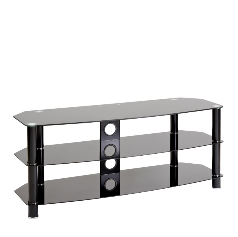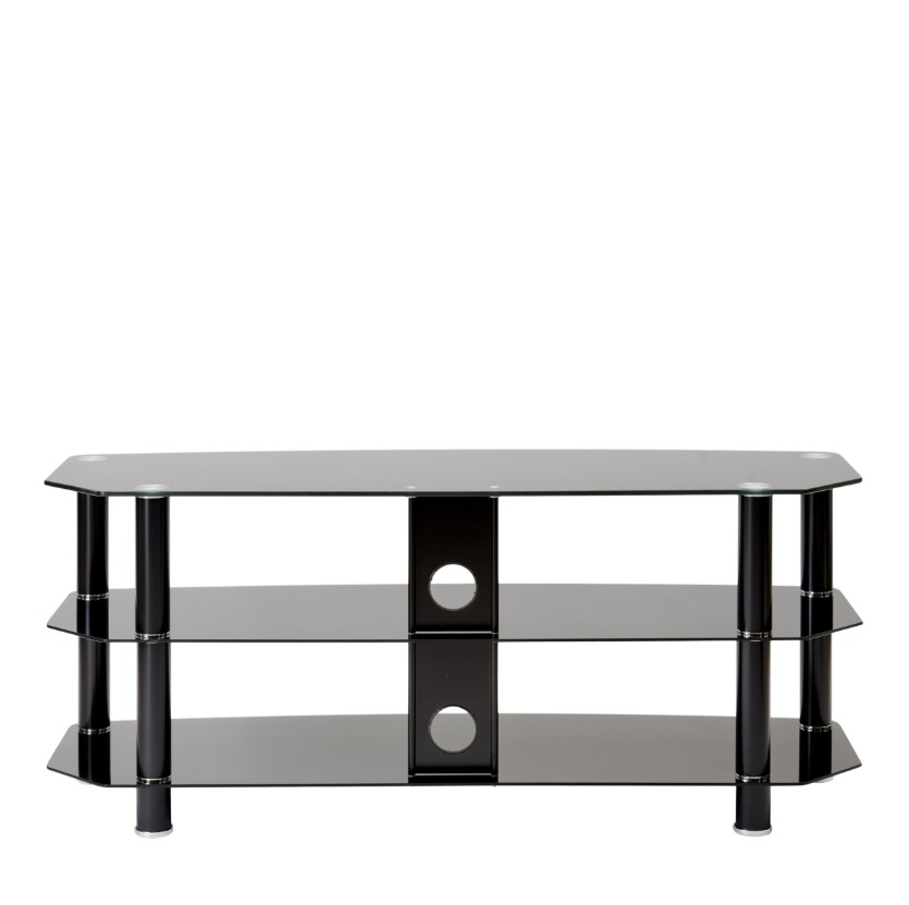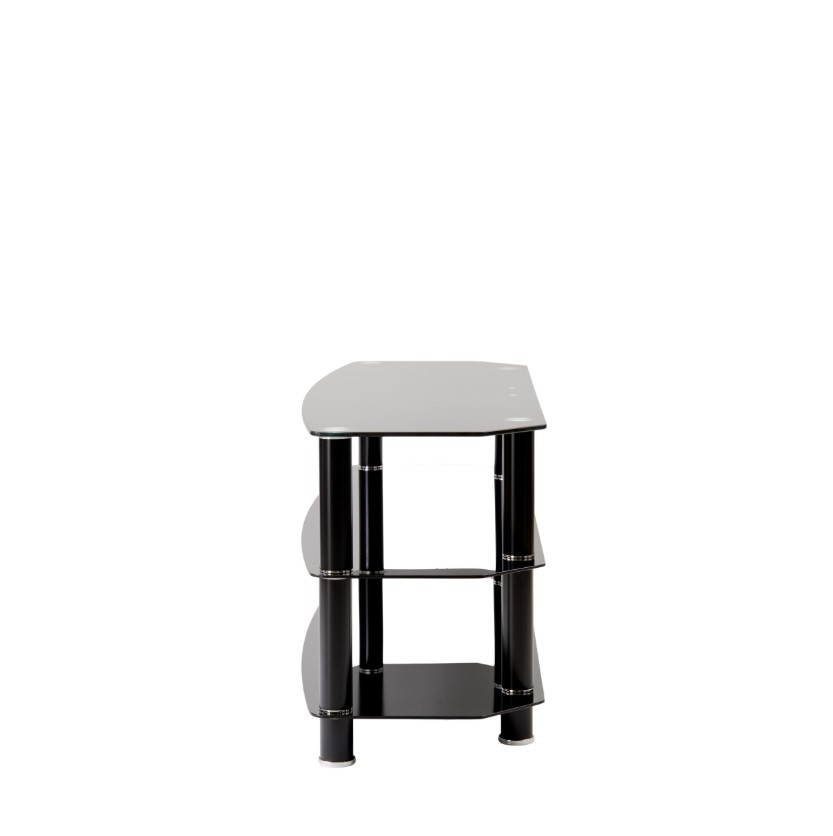 Simple and minimalist, the Vantage TV stand will create an eye-catching focal point in your living room. It is finished with tubular aluminium legs either in chrome and clear glass or matt black with black glass. The chamfered corners mean the stand is ideal for positioning in the corner of the room but also looks good against a living room wall. The three curved glass shelves give plenty of storage space for your electronic accessories, such as a DVD player, satellite box, game console and soundbar.
