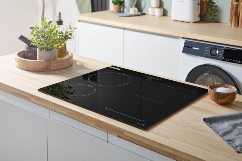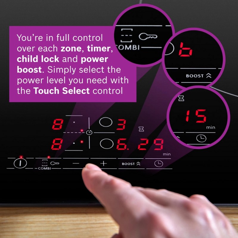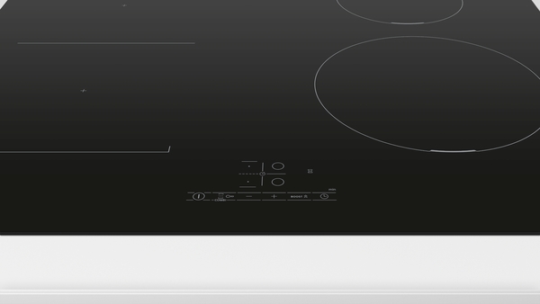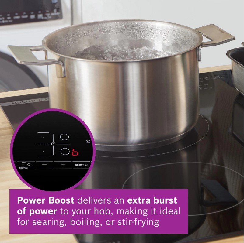 Discover the Bosch PWP611BB5B induction hob with a sleek 59.2cm black surface that brings precision and efficiency to your kitchen.