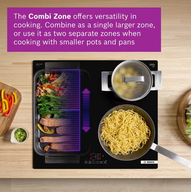 Its innovative CombiZone allows combining two cooking zones into one larger area, perfectly suited for bigger cookware or flexible meal preparation.