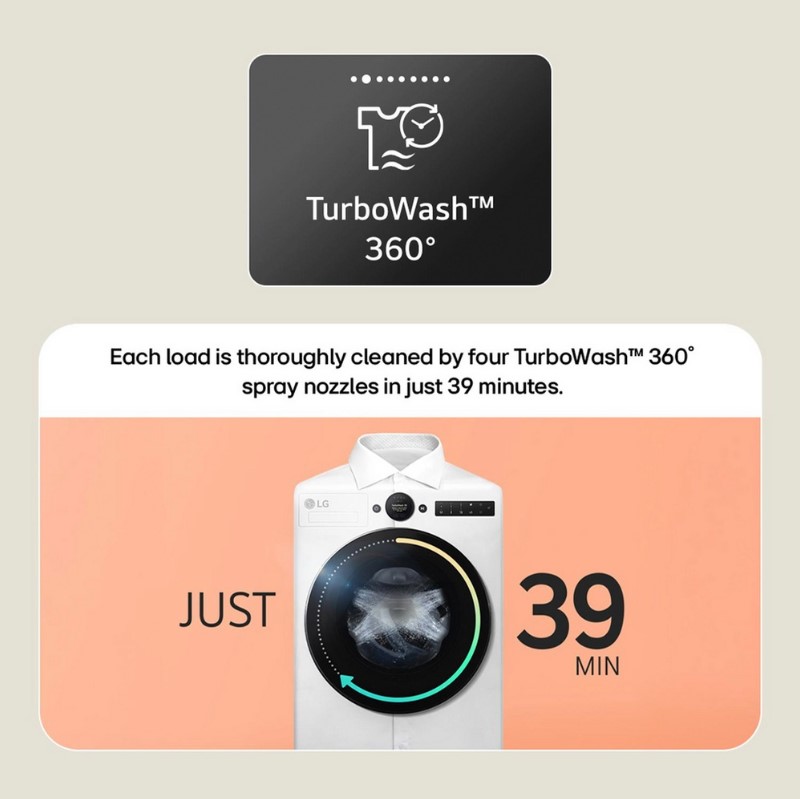 This sleek black appliance incorporates advanced technologies such as TurboWash360, allowing you to complete a 5kg load in an impressive 39 minutes, making it perfect for busy households that value efficiency.