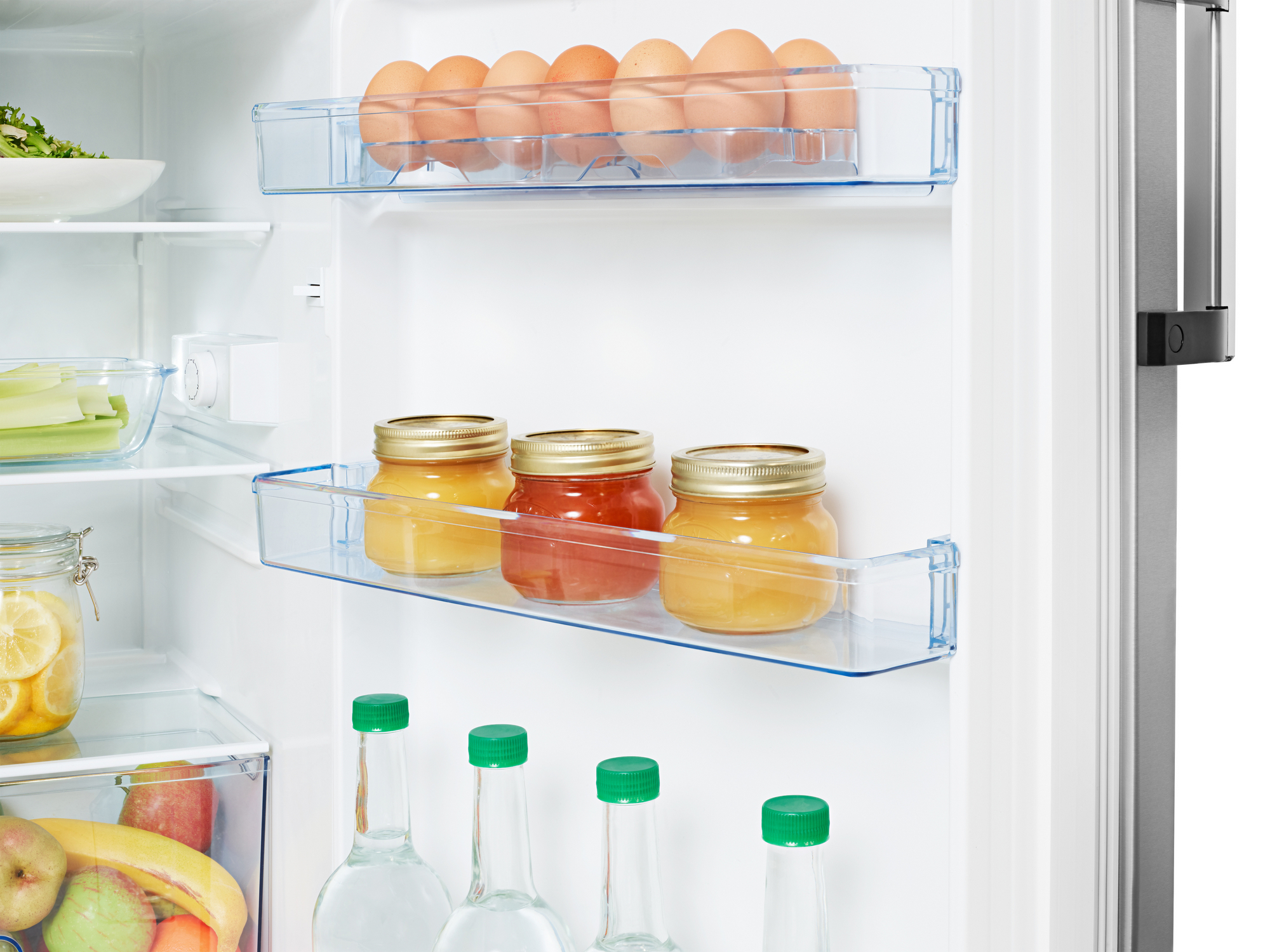 Equipped with sturdy, adjustable tempered glass shelves, this fridge allows for effortless reconfiguration to accommodate larger groceries or containers.