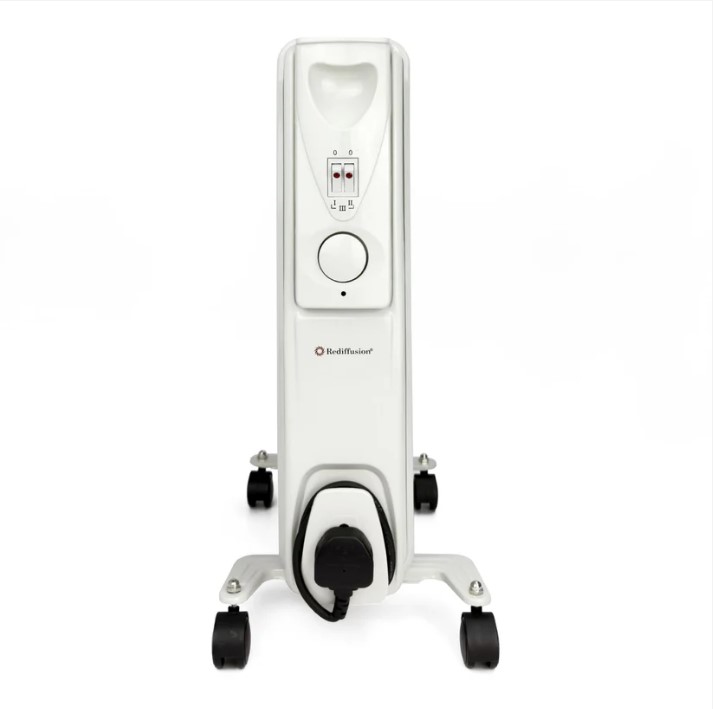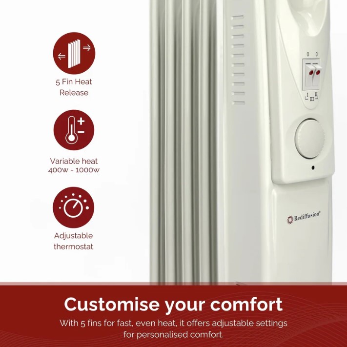 Introducing our efficient oil-filled radiator, perfect for keeping your space warm and cozy. With 5 fins for optimal heat distribution, it provides quick and even warmth. Customise your comfort with variable heat settings and an adjustable thermostat. This compact, lightweight, and portable unit is ideal for small-medium room sizes. Operating at 1000W, it features rapid heat convection technology and automatic overheat protection for safety. Enjoy long-lasting warmth as the heated oil maintains its temperature even when switched off. Plus, it includes convenient cord storage.