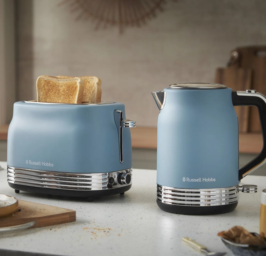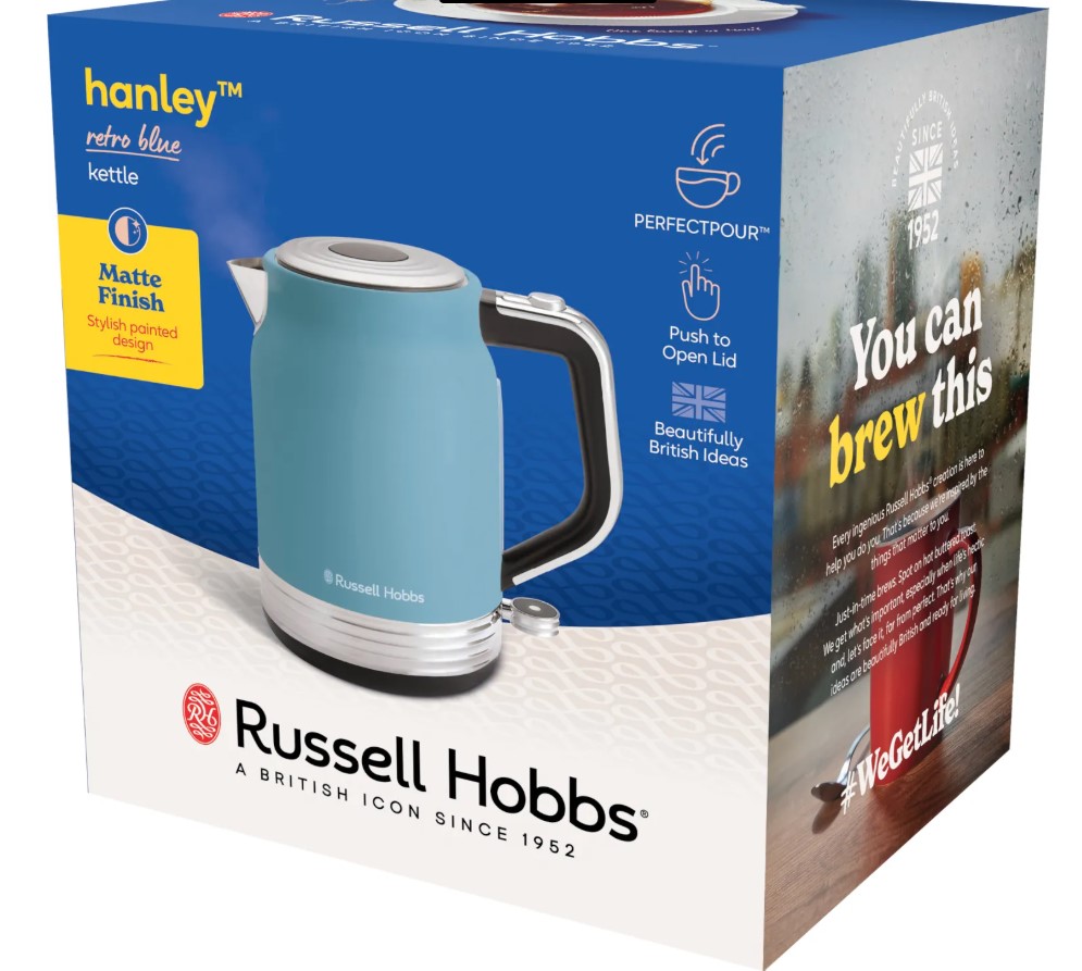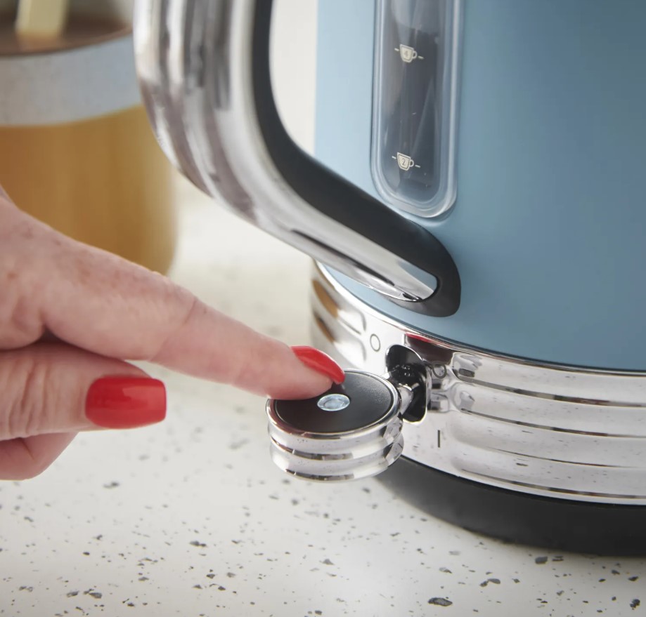 With its sophisticated matte blue palette and distinctive polished accents, the Russell Hobbs Hanley Kettle Retro Blue turns your kitchen aesthetic up a notch. And it will rise to the challenge of even the busiest households thanks to its perfect pour spout, push-to-open lid and 360o base, making pouring, filling and lifting easy and fuss-free. You can wrap the cord into the base for a fresh minimal look and to make cleaning easier. There’ll be no unwanted drips messing up the worktop and the anti-scale filter helps to clear hard water for fresh hot drinks time and again.