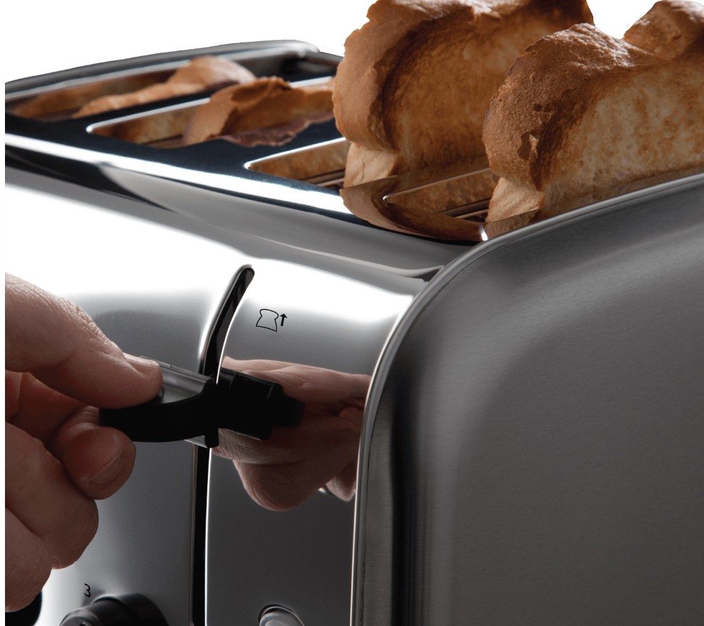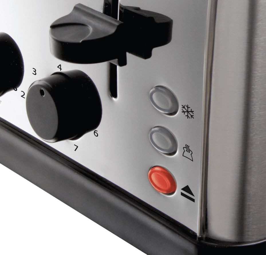 If you like stainless steel for its clean and stylish look, you’ll love the Russell Hobbs Classics 4-Slice Toaster – Brushed with its gleaming curves and brushed side panels.