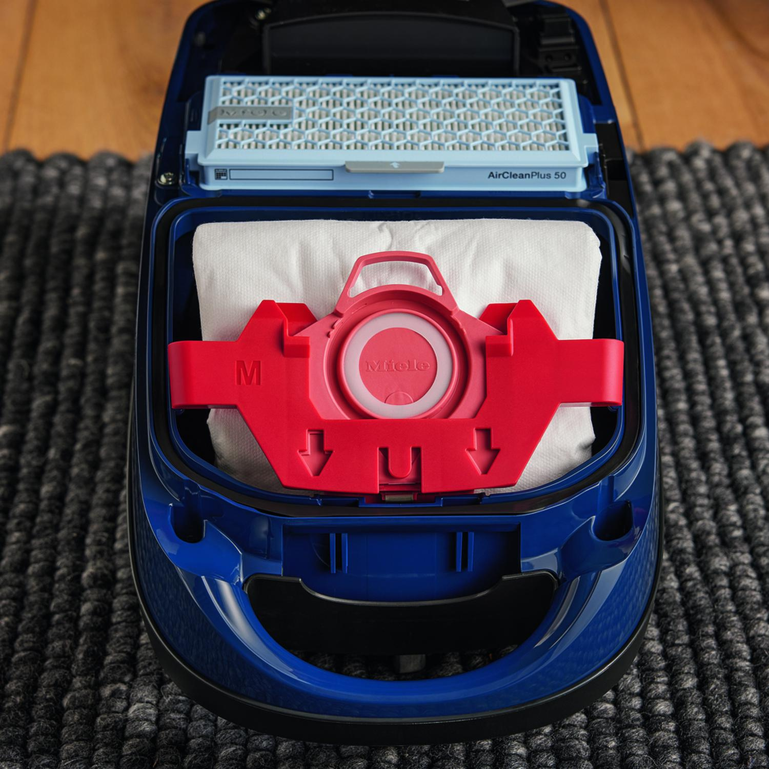 The hygienic bag change design features an automatic collar closure that seals dust inside when the vacuum is opened, reducing allergen exposure and simplifying maintenance.