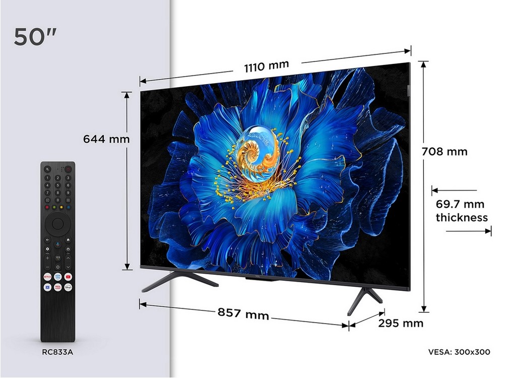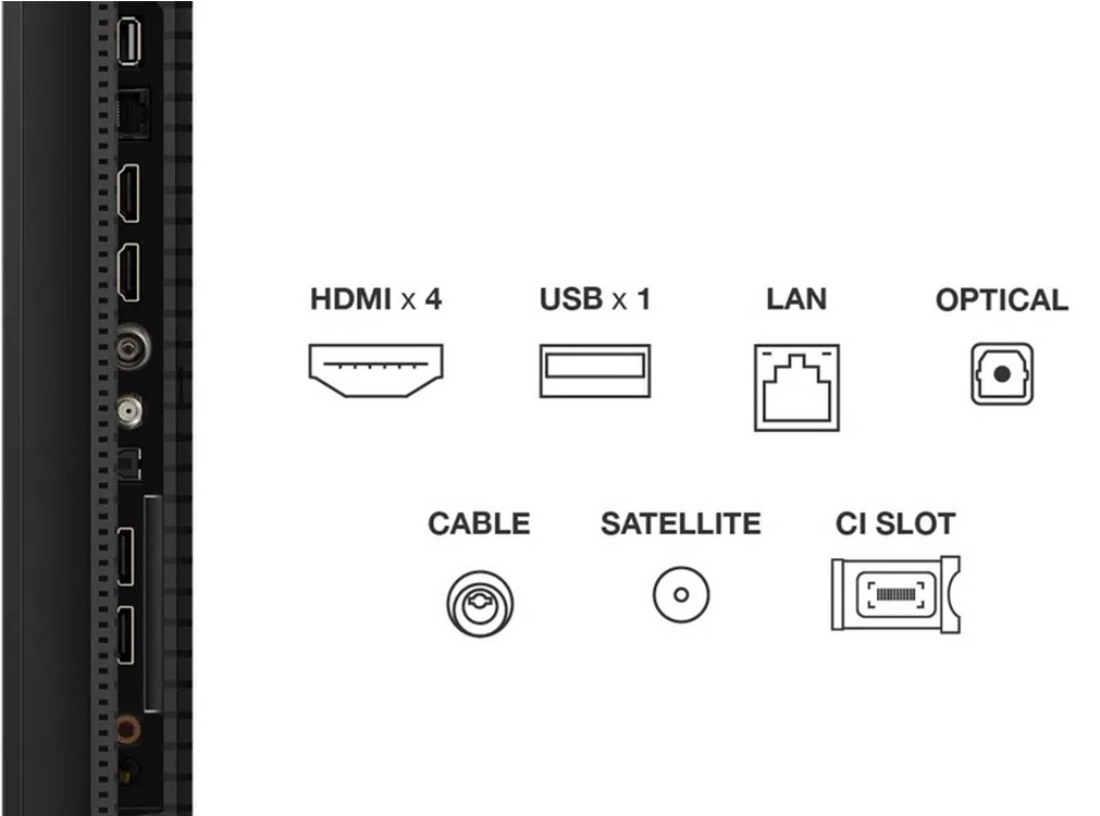 The TV features a very slim chassis, measuring just ~6.7 cm deep. With a VESA mount of 300 × 300 mm, it’s easy to wall-mount and turn into a seamless part of your living space. The understated black finish adds a touch of elegance and will fit well with most décor styles.